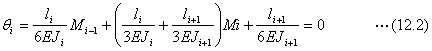 橋梁では移動荷重による最大最小応力の計算をするため、最初に影響線を求めます。死荷重は静的な荷重ですので、影響線を計算しない方法でも応力計算ができます。普通は、影響線の面積計算値を利用して計算書をまとめます。不静定力の影響線を計算するときは、静定基本系に不静定力だけが作用し、不静定力の作用方向の変位成分を求めるだけの弾性条件式を求めます。一般的な多径間連続梁から連続した二径間を取り出して、不静定の支点モーメントと支点での撓み角との関係を図12.11に示します。この図を見るとき、モーメントの正負、変形の正負についての約束を理解しておきます。曲げモーメントは内力ですので、桁に支点上で仮のヒンジを挿入した場合、支点上で左右の曲げモーメントの対を考えます。曲げモーメントは、梁を下向きに曲げる向きを正とし、撓みは、下側に撓む向きを正とします。中間支点上での左右桁断面の相対的は角度の開きθは、左右の桁変形の、接線角度の差です。符号は図12.11のように開く向きが正です。死荷重などの外部荷重が作用すれば、その分で生じる撓み角を計算するのですが、この計算成分を荷重項と言います。影響線の計算では、荷重項の計算を必要としません。弾性条件式を下に示します。