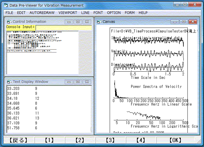 ![]() 科学技術関係の処理を目的としたプログラムの開発は、同じように見えても、処理の中身の違う幾つものプログラムを作成することが多くなる傾向があります。前に作成した同種のプログラムを改変することも普通です。この場合の作業の焦点は、主に標準モジュールにありますので、フォームモジュールに凝る方の労力を簡単に済ませたいところです。これを実現するアイディアは、フォームモジュールの幾つかをプロトタイプとして準備しておくことです。プロトタイプというのは、基本機能を持たせた半完成品であって、カスタム機能を追加すること、ここでは標準モジュールと組み合わせることで完成させます。Visual Basicを使う場合の、実行画面の一例を図24.2に示します。この画面は、三つの子ウインドウを使っています。左上は、システム側から、次にユーザが何をすればよいかの指示情報を表示します。左下はテキストエディタを載せた子ウインドウであって、処理結果の文字出力用です。右半分はグラフィックス出力用子ウインドウです。画面の最下段にステータスバーが設けてあり、そこの番号パネルをクリックすることで処理の選択と制御を行わせます。 2009.12 橋梁&都市PROJECT |