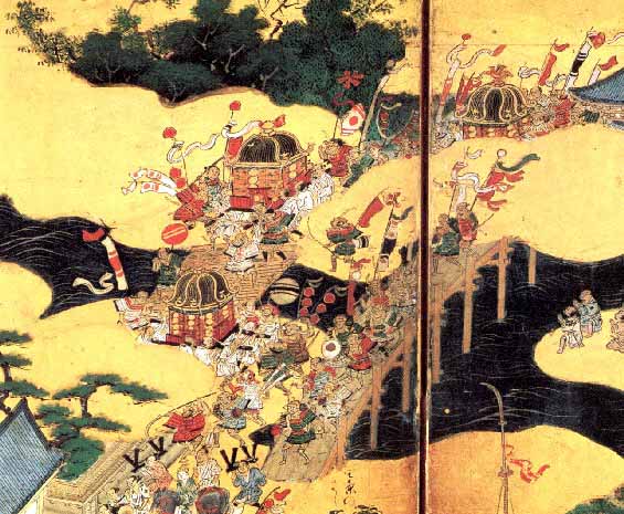 AMNOLDJ056 四条大橋:上杉本による「洛中洛外図屏風」(米沢市教育委員会) ここに描かれた橋は四条の橋で、神輿は仮橋の方を渡っている。 19910131 網野善彦ほか、「天の橋地の橋」福音館書店
