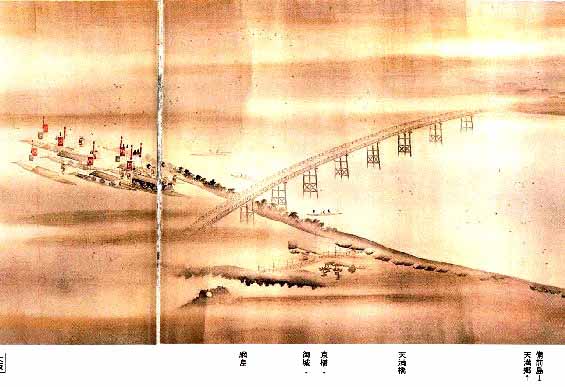 AMNOLDJ058 円山応挙「淀川両岸図巻」の部分その2(アルカンシェール美術館) 天満橋の景観。 19910131 網野善彦ほか、「天の橋地の橋」福音館書店