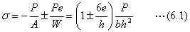 圧縮力を受ける柱は、圧縮力の作用位置が、必ずしも断面の重心(芯)を通るとは限りません。重心からのズレ(偏心距離)が柱断面に曲げモーメントを作用させます。ズレが大きくなければ、柱全断面が圧縮応力度の場になります。しかし、ズレが大きくなると引張応力度が荷重の作用位置と反対側に出るようになります。この解析を、まず、軸力とその偏心で生じる曲げモーメントを受ける矩形断面の梁として扱います(図6.1)。矩形断面の重心を通る縦軸に沿って軸力の作用位置eを移動させると、縁応力度な下の式(6.1)で得られます。