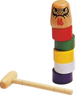 玩具の積み木を高さ方向に積み上げると、案外不安定な構造の柱になることに気が付きます。積み木で構成する柱は、接触面で引張力が作用しません。面の接触が不均一で、柱として鉛直性からずれる変形があると、力を伝える面が偏り、力の作用軸が接触面を外れる個所が起き、そこで倒壊が始まります。ダルマ落とし(図6.5)は、高さが低い円柱を重ねます。図6.4で見るように、核の幅が矩形断面よりも相対的に広くなっている分、ズレの許容が大きくなります。面の繋ぎに、曲げに抵抗できるようにするには、別の材料を挟んで引張力が発生する個所を補強するアイディアを使います。そうすると、積み木では玩具の使い方ができなくなります。鉄筋コンクリートの梁も、考え方の基本は同じです。コンクリートは、幾らかの引張強さを持ちますので、鉄筋を使わなくても、梁として使える曲げモーメントの範囲があります。積み木を積み上げるような状態を想定して、引張に抵抗する材料に鉄筋を使うことが、鉄筋コンクリート梁の計算の考え方です。