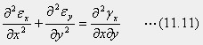 三番目の条件として、変位の性質についての条件を使います。二次元弾性体の或る個所(x,y)の変位を、座標軸方向の成分に分けて(u,v)で表すと、歪みは、次の式で定義されます。![]() 適合条件は、隣接する弾性体の座標間で相対的な位置の入れ替えが起こらない、とする条件です。微分レベルで扱う式は、