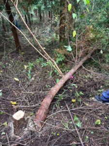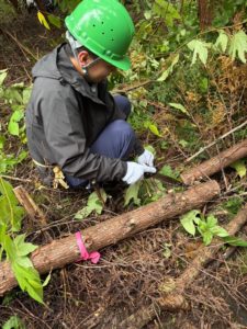長野県木曽町の森林の傾斜面で間伐作業を行いました。