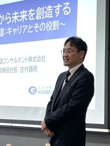 「失われた30年」と言われる平成時代(1990~2020 年代)の背景と変化を示しながら、学生から建設コンサルタントの社長となるまでのキャリアに基づき、各役職で求められる役割、これからの社会展望や、期待される技術者像などを話しました。